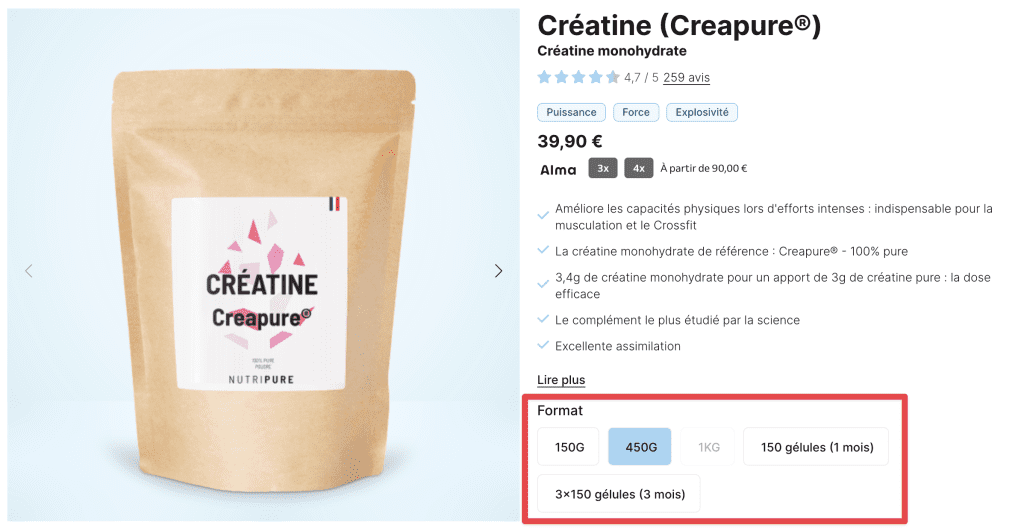 Nutripure propose deux formats principaux pour sa créatine.