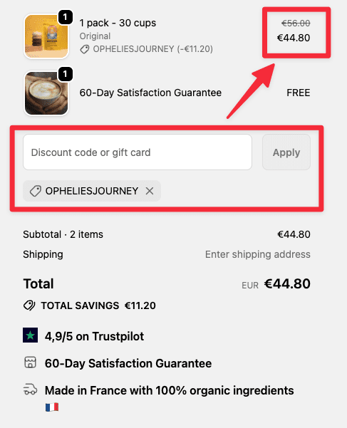 All you have to do is enter OPHELIESJOURNEY in the “Discount code or gift card” field.